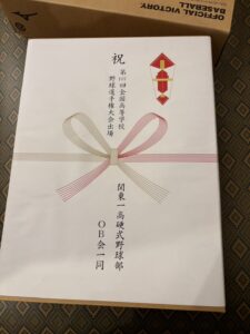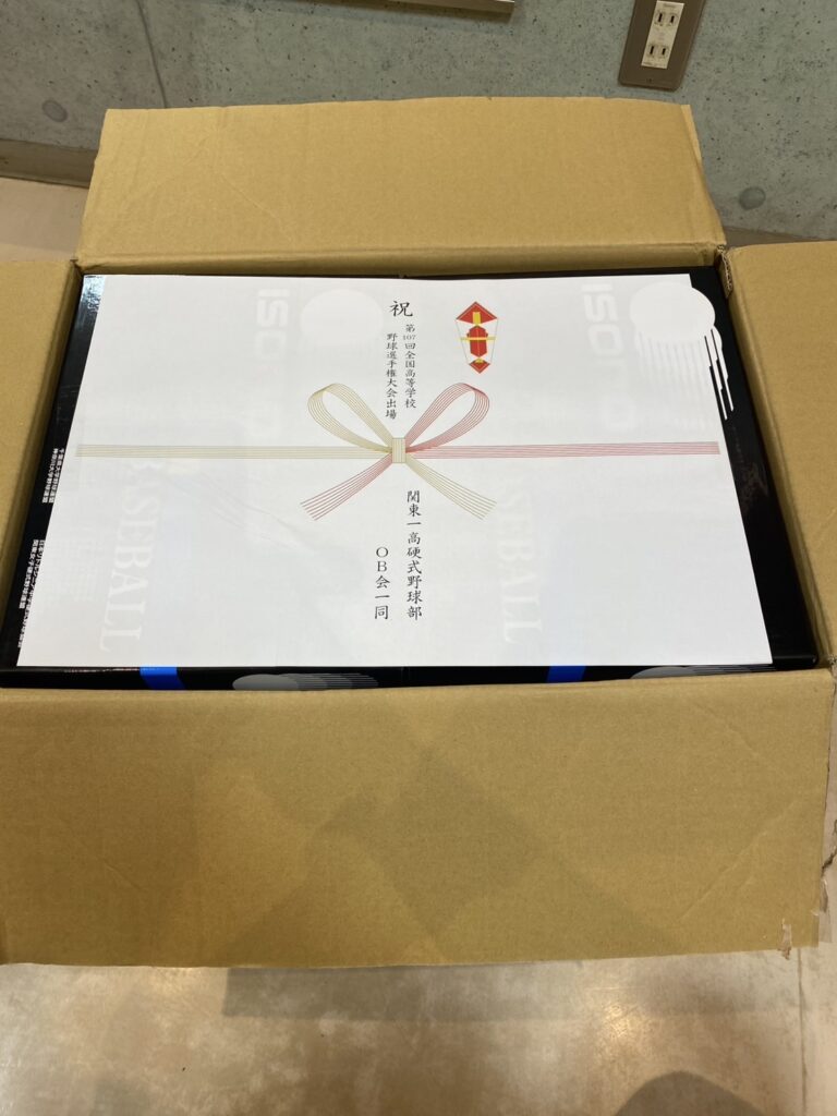 OB会より夏大前にも公式試合球を贈り、今回は、甲子園出場お祝いとしてイソノ東東京公式専用硬式ボールを寮に贈りました。しっかり慎二コーチからお礼の連絡を受けました。